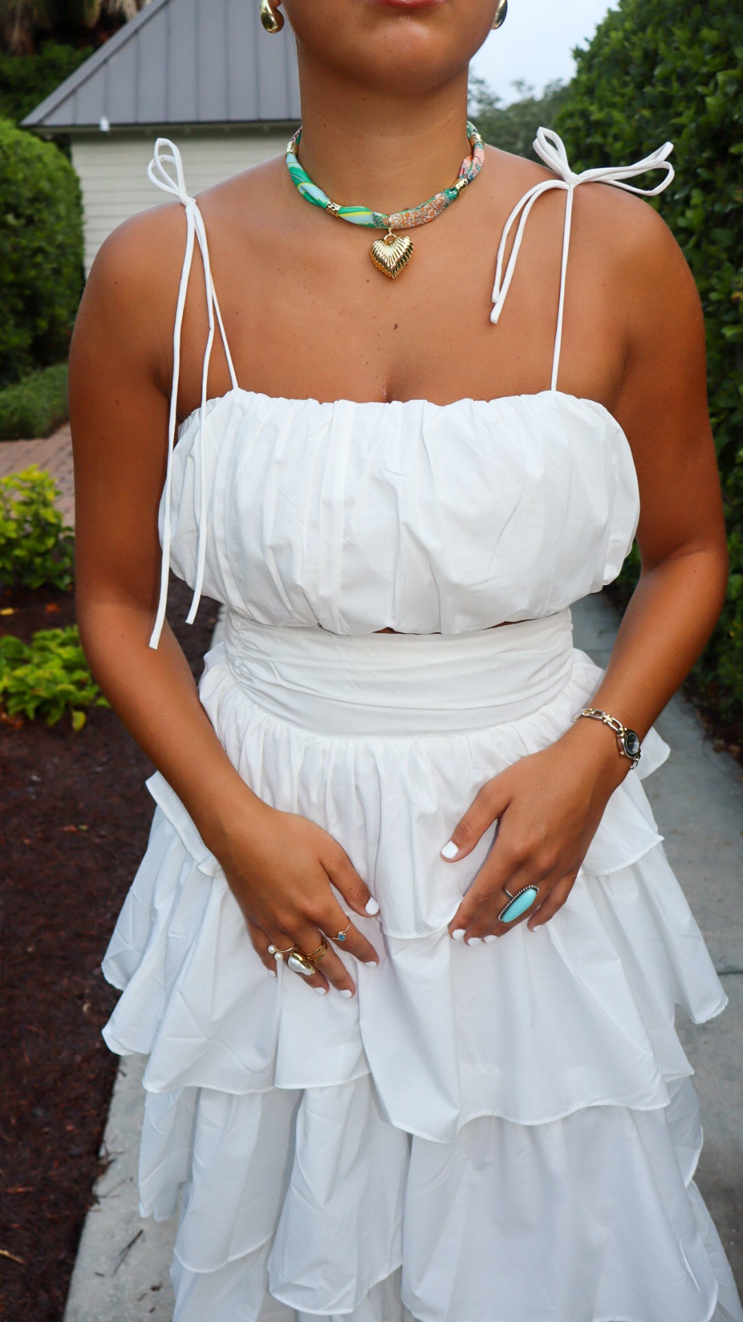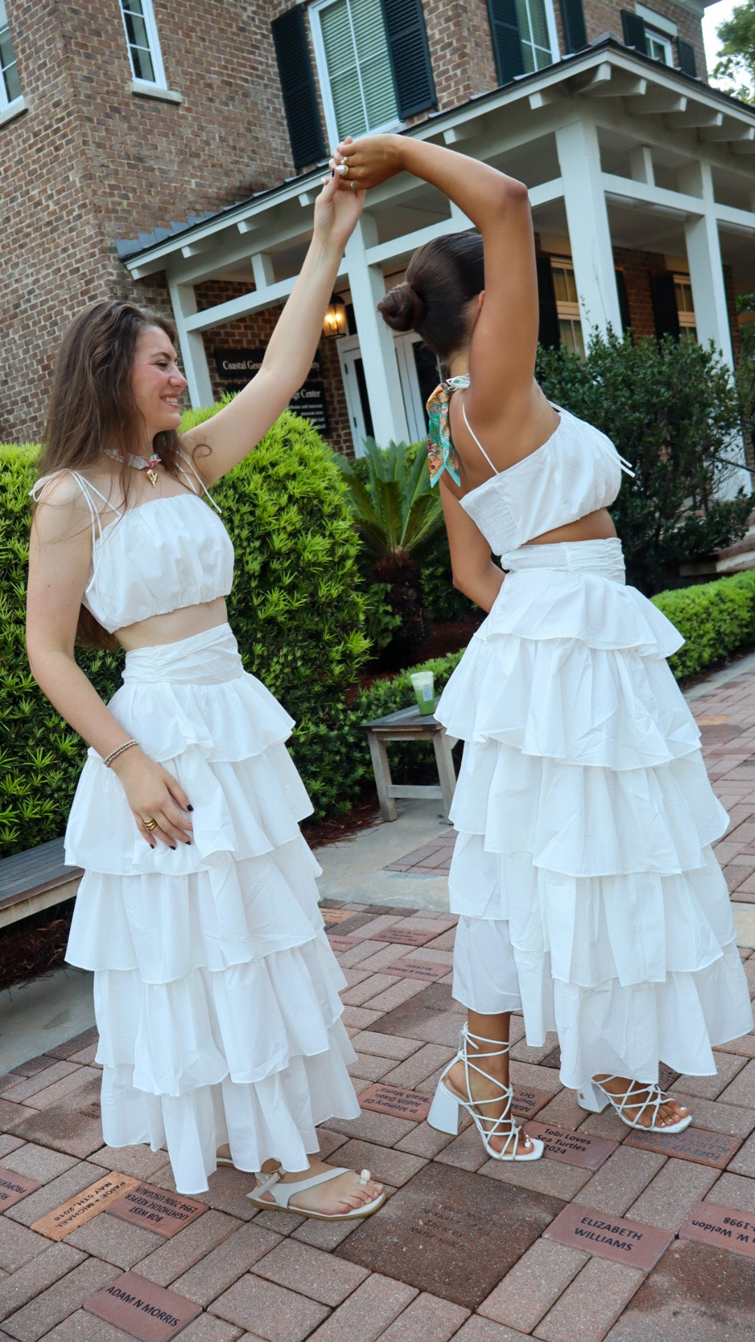 Flirty, fun, and effortlessly feminine. The Darling Set is your go-to for warm-weather days and nights. Featuring a ruched tie-strap crop top and a tiered, flowy maxi skirt, this look brings soft drama with every step. Whether it’s game day, a casual outing, or a spontaneous night out, this set makes getting ready feel easy and exciting. Sofia paired the set with our Tahiti Scarf Necklace and Parker is wearing our Palm Scarf Necklace.