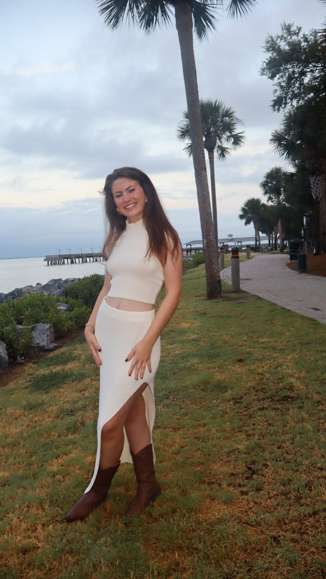 This cream knit two-piece set is effortlessly sleek and versatile. Perfect for a night out, game day, or any occasion where you want to turn heads. The high-neck crop top pairs perfectly with the high-waisted maxi skirt, featuring a flattering side slit for just the right amount of edge. Parker styled the set with cowboy boots.